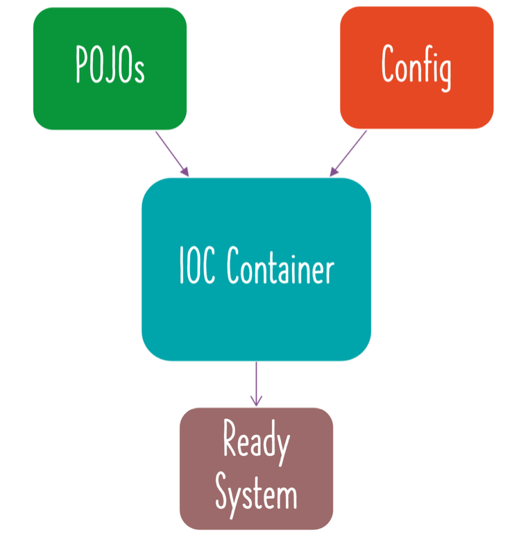 위 사진에서는 IOC Container에 클래스와 설정 파일을 넣으면 출력으로 Ready System 이라는 것을 내놓는 것을 볼 수 있다.
